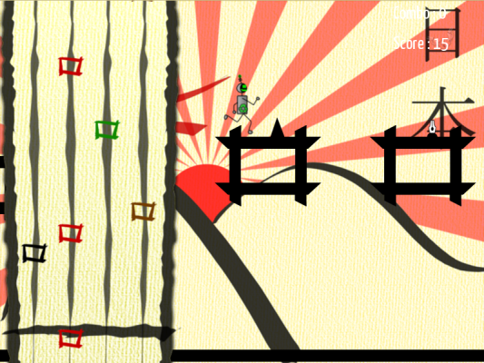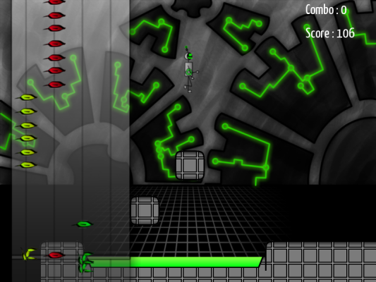 8-Bit Robot Music Party (8RMP) is a rhythm / platform game where you and your friend (we hope you have any) help your third (virtual) friend who is stuck in the game. The first player has to deal with the music like a Guitar Hero while the second plays, mario-style, with the little robot Everbot. The players must finish the level before the end of the music.