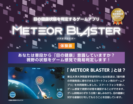 Meteor Blaster is a shooting game set in outer space to the evaluate the condition of the player’s field of vision by spending a total of only 5 mins working with each eye. It is being developed by Sendai Television and the Tohoku University School of Medicine.